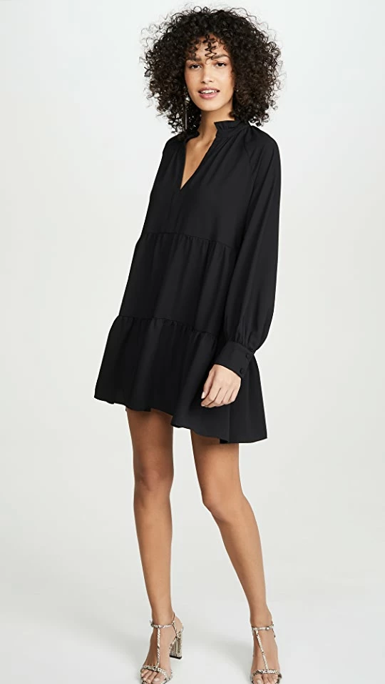 A little black dress that is anything but basic. This versatile Amanda Uprichard dress features a relaxed silhouette finished with a tiered, ruffled hem.