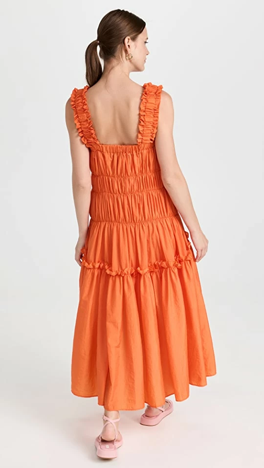 - Tiered design with shirred elastic seams