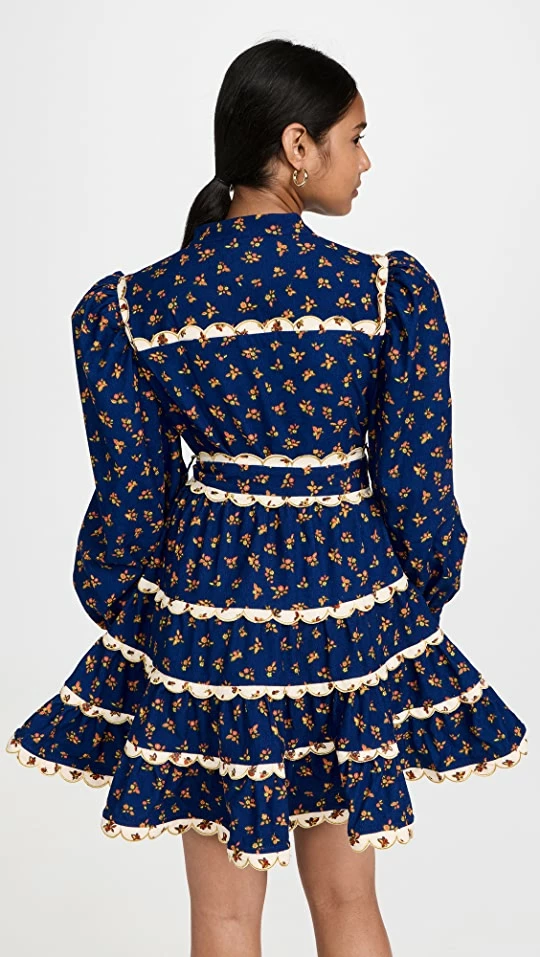 - Tiered design and contrast scallop trim with metallic embroidery