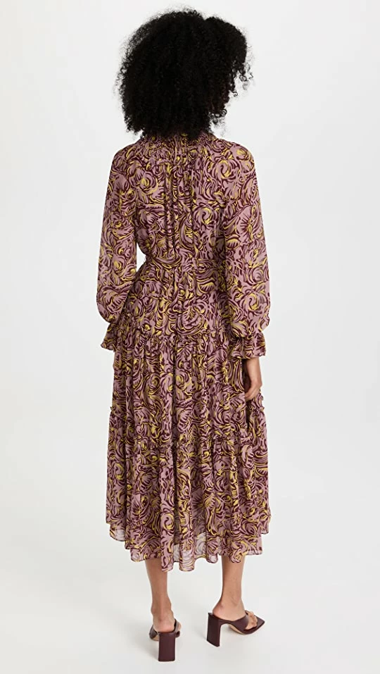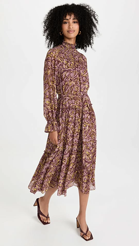 A lightweight party dress from Cinq a Sept, featuring a smocked mock neckline and a swirling abstract pattern that’s sure to entrance. Complete your look with the heeled sandals of your choice.