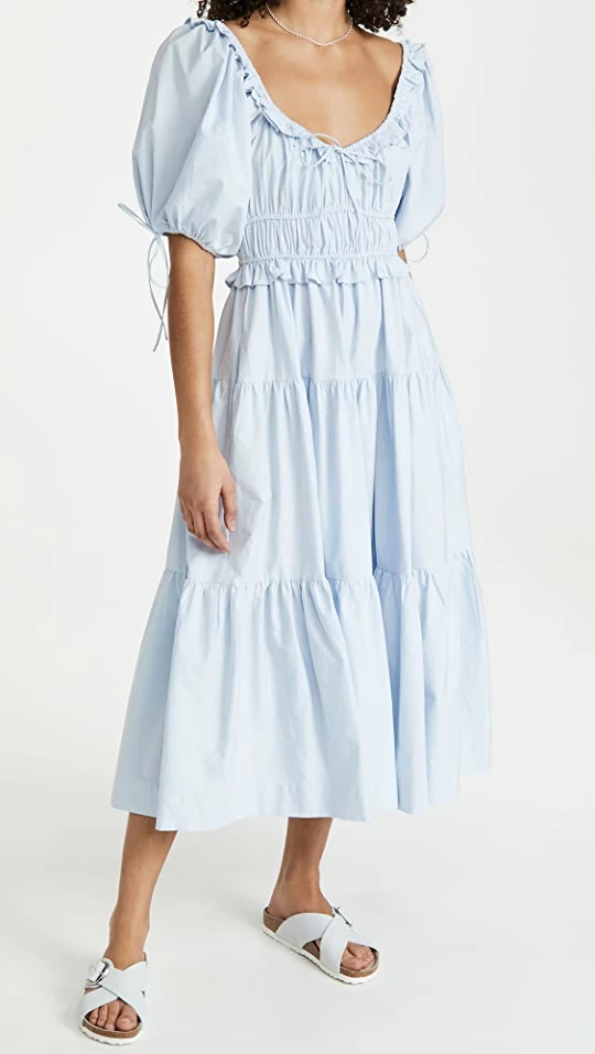 Crafted in pale blue poplin and featuring a tiered silhouette enhanced with ruffles and puff sleeves, this En Saison dress is a romantic addition to your warm-weather wardrobe which will easily transition from day to night with just a simple change of shoes.