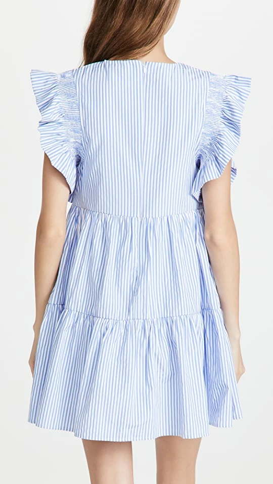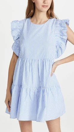 A refreshing take on a timeless style. This English Factory dress is crafted from crisp striped shirting and features a tiered skirt and flutter sleeves for a romantic version of a polished, everyday piece.