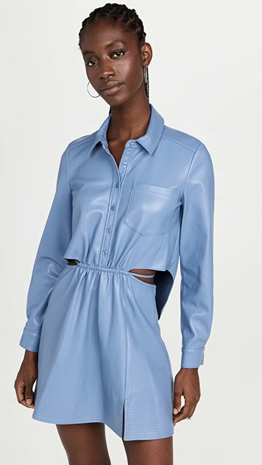 Composed of light-blue faux leather and designed with a wraparound cutout at the waist, this Jonathan Simkhai shirtdress is a unique choice for a special occasion.