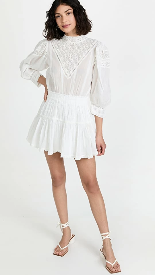 Lightweight and pretty as a picture, this LoveShackFancy white dress gains a touch of extra romance from lace embellishments throughout the silhouette. All you’ll need to complete your outfit is a pair of tonal heels.