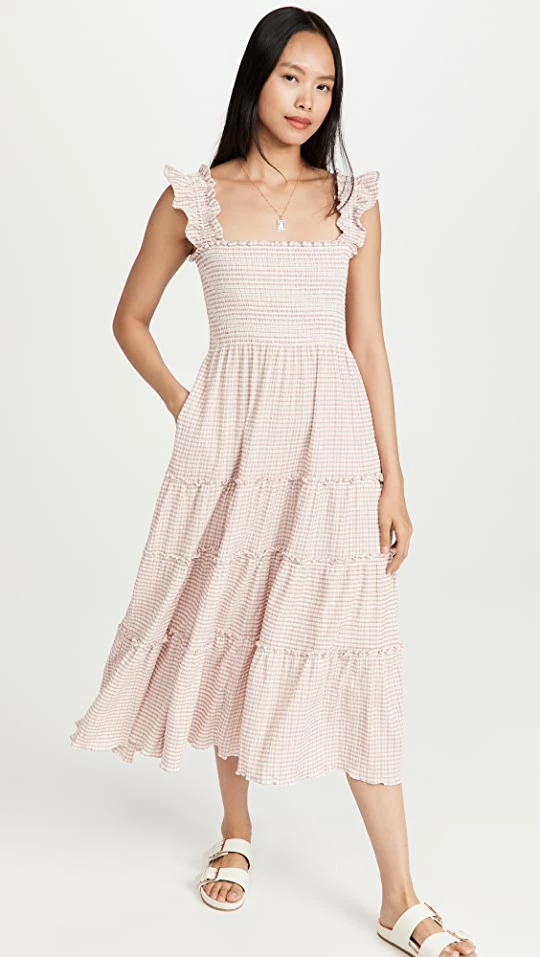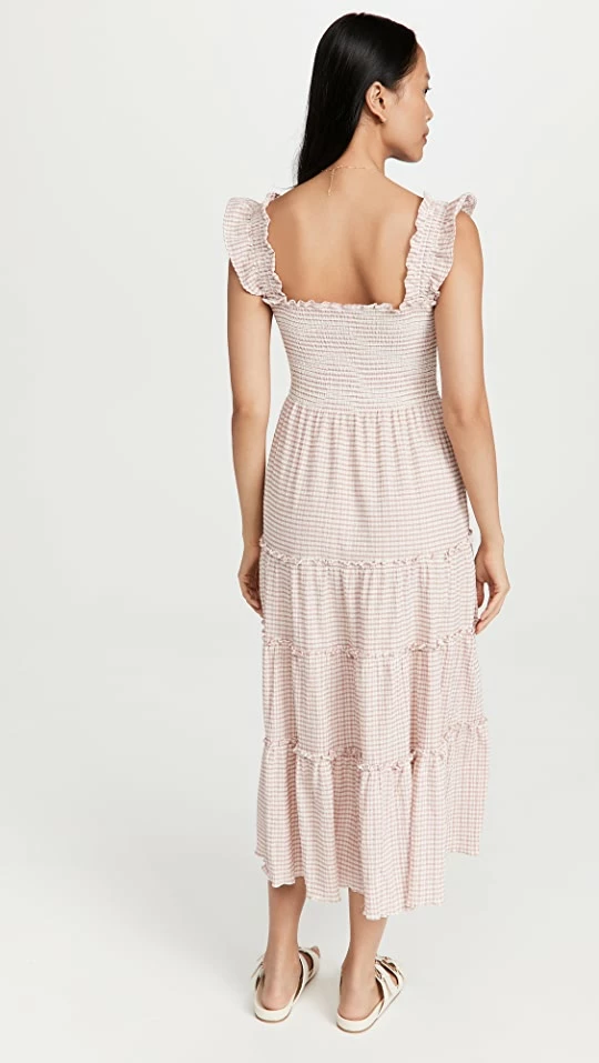 A sweet and summery midi with a breezy meets romantic feel, this OPT dress features a pale pink plaid, swingy skirt, and ruffled shoulders for a piece that will easily fit into your sunny-day agenda.