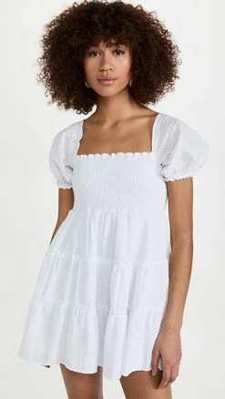 Simple, sweet, and ready for summer! This Peixoto mini dress is crafted in bright white seersucker and features puff sleeves and a smocked bodice for a charming and subtly retro look.