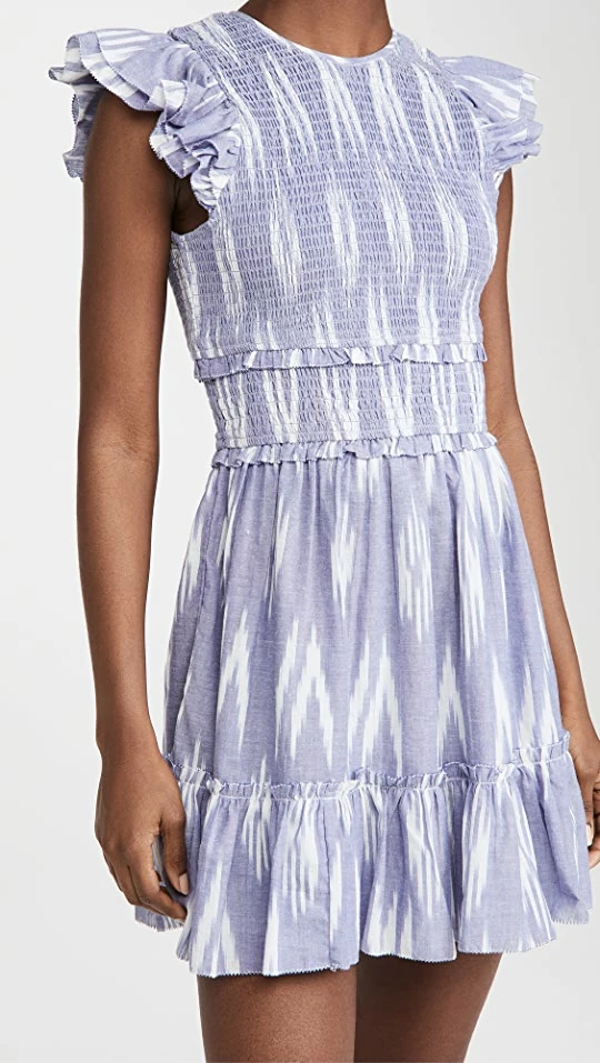 Summery ikat gets a pretty makeover, courtesy of Saylor. This mini dress is romantically proportioned with a smocked bodice and fluttery shoulder ruffles, and works equally well with flat slides and strappy sandals.
