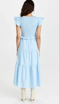 Cut from crisp cotton and featuring flutter sleeves and a smocked bodice, this Sea dress adds a romantic element to your everyday ensembles. All sorts of flats and boots will pair well with this versatile, baby-blue midi.