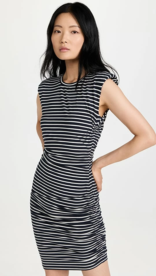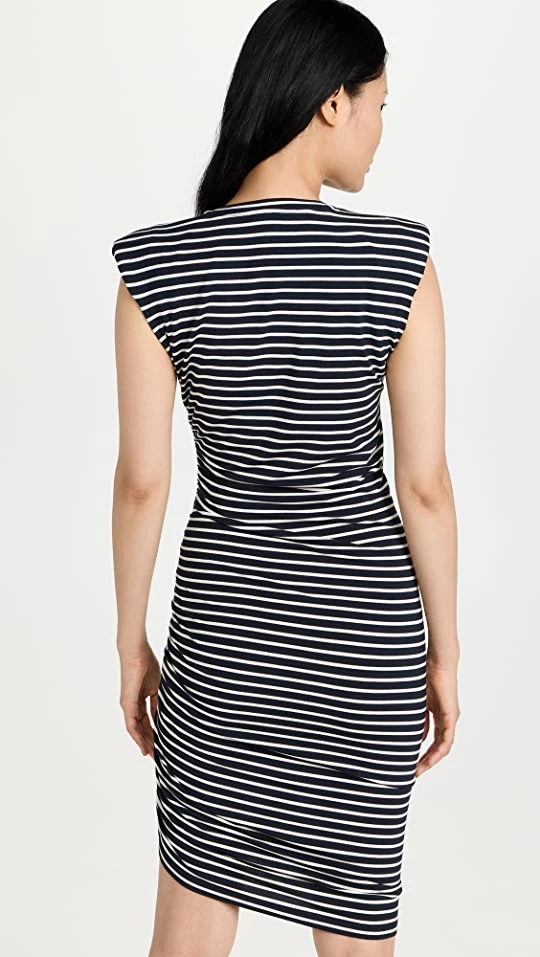 Gently figure-hugging and tidily striped, this Veronica Beard Jean dress is a versatile weekend basic with timeless style. Padded shoulders add a touch of structure to the silhouette. To complete your outfit, go with flat slide sandals.