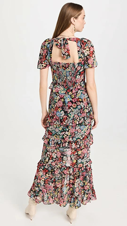 - Tiered skirt seams with ruffle trim